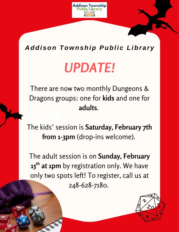 Kids: come learn how to play this fun tabletop role-playing game! Drop-ins welcome. All supplies provided.